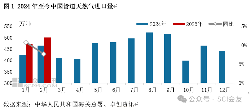 據(jù)卓創(chuàng)資訊統(tǒng)計(jì)海關(guān)數(shù)據(jù)顯示,2025年1-2月中國(guó)管道天然氣進(jìn)口量為501.05萬(wàn)噸,同比上月增長(zhǎng)81.35萬(wàn)噸,漲幅9.14%。盡管本月管道氣進(jìn)口量環(huán)比下降,但管道氣總進(jìn)口量同比增長(zhǎng)3.93%,隨著中俄進(jìn)口管道全面完工,來(lái)自俄羅斯管道天然氣進(jìn)口量維持增量供應(yīng)。