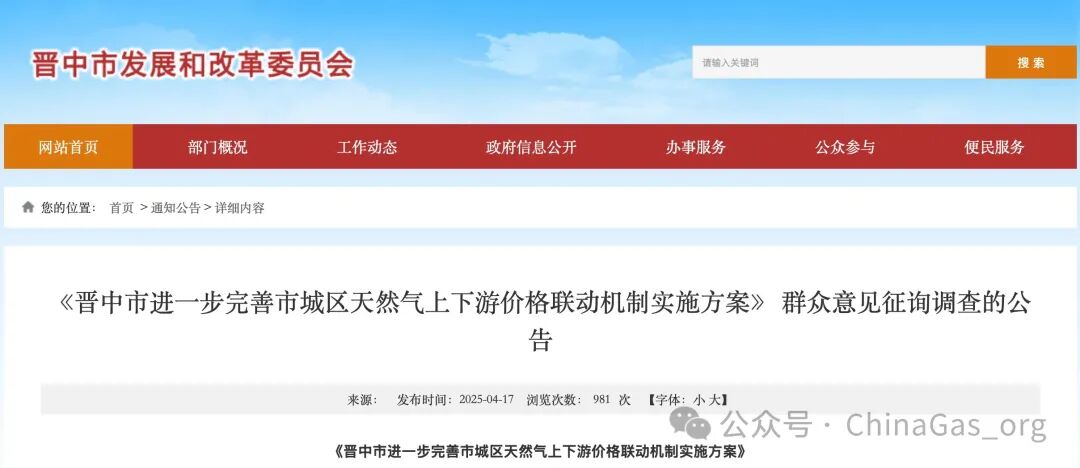 晉中市進一步完善市城區(qū)天然氣上下游價格聯(lián)動機制實施方案為充分了解社會各界對《晉中市進一步完善市城區(qū)天然氣上下游價格聯(lián)動機制實施方案》決策事項的意見和訴求,根據(jù)中央、省、市相關(guān)文件的要求,由山西納謨爾森工程咨詢有限公司對“晉中市進一步完善市城區(qū)天然氣上下游價格聯(lián)動機制實施方案”進行群眾意見征詢調(diào)查的工作,現(xiàn)將該決策事項的基本信息及所涉及的內(nèi)容進行公告,征詢和收集公眾對該事項的意見及建議。晉中市進一步完善市城區(qū)天然氣上下游價格聯(lián)動機制實施方案為貫徹落實國家和省深化天然氣價格改革任務(wù),進一步完善天然氣價格形成機制,按照山西省發(fā)展改革委《關(guān)于貫徹落實<國家發(fā)展改革委關(guān)于建立健全天然氣上下游價格聯(lián)動機制的指導意見>有關(guān)事項的通知》要求,晉中市發(fā)展和改革委員會發(fā)布了《關(guān)于進一步完善天然氣價格聯(lián)動機制的通知》,具體內(nèi)容如下:天然氣終端銷售價格與城燃企業(yè)氣源采購價格(含運輸費用)實行聯(lián)動。城燃企業(yè)購氣價格變動達到或超過0.1元/立方米時,適時啟動價格聯(lián)動機制。氣源采購價格變動幅度未達到啟動條件時,天然氣終端銷售價格不作調(diào)整,納入下一次聯(lián)動調(diào)整范圍。管道運輸價格、配氣價格調(diào)整時,天然氣終端銷售價格同步同額同向調(diào)整,不受聯(lián)動頻次限制。如國家和省對天然氣價格另有政策規(guī)定,按照國家和省有關(guān)政策執(zhí)行。居民用氣價格聯(lián)動周期不少于一年。非居民用氣終端銷售價格執(zhí)行季節(jié)性差價,聯(lián)動周期原則上一年兩次,聯(lián)動機制時間為非采暖季(當年4月至10月)和采暖季(當年11月至次年3月)。居民氣價聯(lián)動上漲幅度實行上限管理,本期居民氣價聯(lián)動上調(diào)幅度不超過0.5元/立方米時,同步同額同向調(diào)整;超過0.5元/立方米時,超出部分統(tǒng)籌考慮,居民下調(diào)幅度不限。非居民氣價聯(lián)動原則上按照氣源平均采購價格變動同步同額同向調(diào)整。當天然氣上游價格上漲過高時,綜合考慮社會承受能力,按照兼顧城燃企業(yè)、消費者利益,保持經(jīng)濟平穩(wěn)運行的原則,報請市政府研判,可暫時中止聯(lián)動。應調(diào)未調(diào)額度在下一個調(diào)整周期統(tǒng)籌考慮。天然氣終端用戶銷售價格由購氣價格(含稅)和配氣價格組成。多氣源供氣時,采購氣價格按不同氣源采購氣價格加權(quán)平均確定。終端用戶銷售價格=采購氣價格加權(quán)平均價格+配氣價格。氣價聯(lián)動調(diào)整后的終端銷售價格=上期終端銷售價格+價格聯(lián)動調(diào)整額。價格聯(lián)動調(diào)整額=(本期加權(quán)平均采購價格-上期加權(quán)平均采購價格)÷(1-供銷差率)+上期應調(diào)未調(diào)金額及偏差金額。供銷差率依據(jù)《山西省發(fā)展和改革委員會關(guān)于印發(fā)〈管道運輸和配氣價格管理辦法〉的通知》(晉發(fā)改規(guī)發(fā)〔2024〕1號),按4%核定。依據(jù)法定程序建立的管道天然氣上下游價格聯(lián)動機制,在制定具體價格水平時不再履行價格聽證、規(guī)范性文件“三統(tǒng)一”等程序。當氣源采購價格變動達到啟動條件時,由城燃企業(yè)向價格主管部門提出價格聯(lián)動申請,價格主管部門依據(jù)天然氣上下游價格聯(lián)動機制,及時調(diào)整天然氣終端銷售價格。價格主管部門開展價格調(diào)查時,上游供氣企業(yè)、城鎮(zhèn)燃氣企業(yè)等有關(guān)單位應當如實反映情況,書面提供說明天然氣價格調(diào)整幅度、調(diào)整時間的上下游企業(yè)價格確認函、合同原件、結(jié)算單據(jù)、發(fā)票、用戶情況等資料。居民天然氣終端銷售價格調(diào)整,經(jīng)市政府批準后,通過價格主管部門、城燃企業(yè)門戶網(wǎng)站等提前10個工作日對社會公告執(zhí)行;非居民天然氣終端銷售價格調(diào)整,由價格主管部門審核確定后,通過價格主管部門、城燃企業(yè)門戶網(wǎng)站等提前10個工作日對社會公告執(zhí)行。鼓勵城燃企業(yè)通過技術(shù)改造、加強內(nèi)部管理等方式主動降本增效,對明顯低于國家準許成本增收節(jié)支部分,由企業(yè)和用戶共享。城燃企業(yè)應采用多種方式努力降低氣源采購成本,對采購價格明顯高于當期市場價格水平且無充分理由及依據(jù)的,高出市場價格平均水平部分不予疏導。強化激勵和約束,建立天然氣上下游價格聯(lián)動后,由價格主管部門在當期價格聯(lián)動結(jié)束后,對上期價格聯(lián)動執(zhí)行情況進行成本調(diào)查,并將成本調(diào)查結(jié)果作為下期價格聯(lián)動調(diào)整的影響因素。1.控制采購成本。城燃企業(yè)接受價格主管部門的指導,密切關(guān)注天然氣市場動向,科學預判用氣需求,在保障天然氣供應的同時,持續(xù)優(yōu)化氣源采購渠道和結(jié)構(gòu),合理控制氣源采購成本,實現(xiàn)降本增效。2.強化價格監(jiān)測。城燃企業(yè)及時、完整、準確報送價格和成本相關(guān)信息,并在企業(yè)門戶網(wǎng)站(無網(wǎng)站可在營業(yè)場所)定期公開采購價格信息,主要包括購氣來源、購氣數(shù)量、采購價格、氣量結(