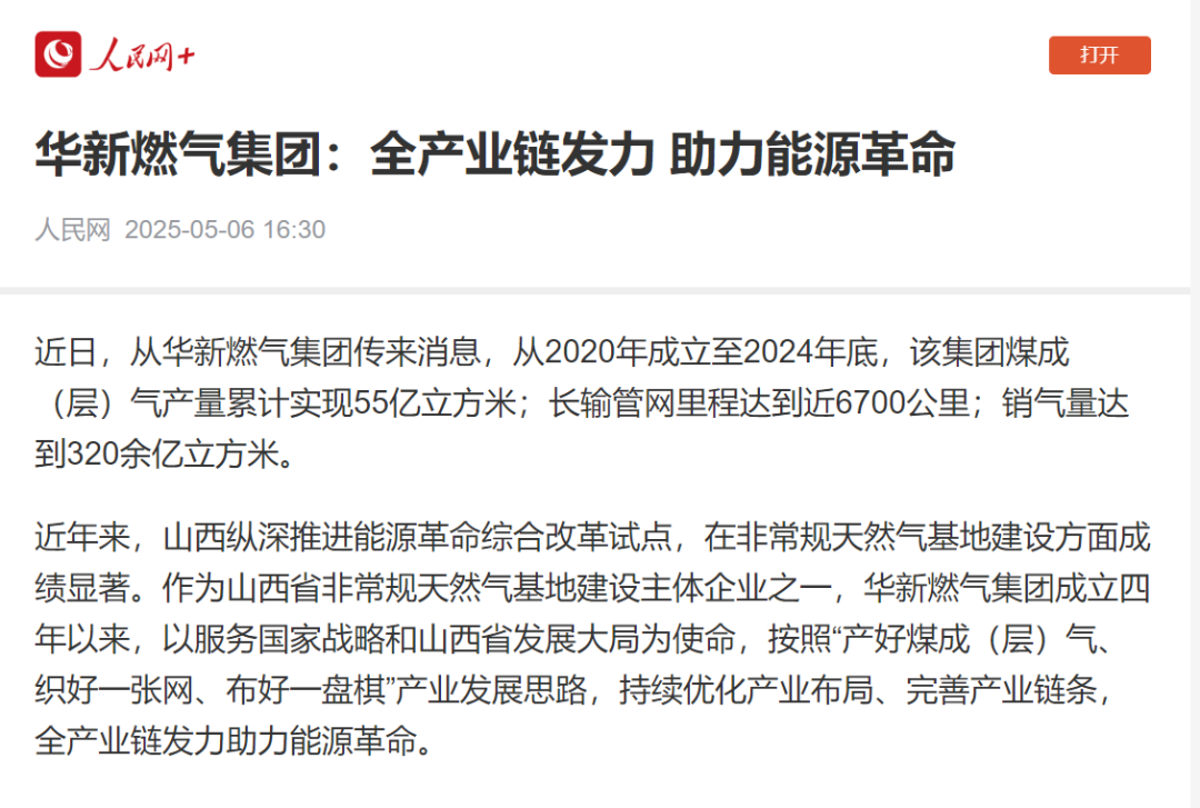 近日,從華新燃?xì)饧瘓F傳來消息,從2020年成立至2024年底,該集團煤成(層)氣產(chǎn)量累計實現(xiàn)55億立方米;長輸管網(wǎng)里程達到近6700公里;銷氣量達到320余億立方米。