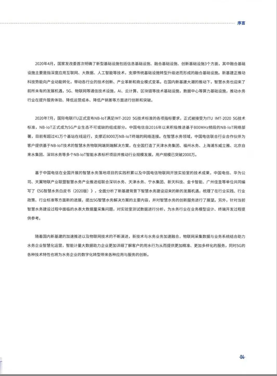 為了更好推動智慧城市公共服務(wù)領(lǐng)域的高質(zhì)量規(guī)模發(fā)展,中國電信和華為公司聯(lián)合新天科技等行業(yè)專家單位基于落地項目的實踐積累,編寫了行業(yè)白皮書。此次發(fā)布是繼2017年以來第四次面向水務(wù)、燃?xì)庑袠I(yè)發(fā)布白皮書。本次發(fā)布的白皮書全面分析了新基建背景下智慧水務(wù)、智慧燃?xì)饨ㄔO(shè)迎來的新的發(fā)展機(jī)遇,梳理了在行業(yè)實踐、行業(yè)政策、行業(yè)標(biāo)準(zhǔn)等方面新的進(jìn)展,提出5G智慧水務(wù)、智慧燃?xì)饨鉀Q方案的主要內(nèi)容,并對未來智慧水務(wù)和智慧燃?xì)獾膭?chuàng)新服務(wù)進(jìn)行了展望。