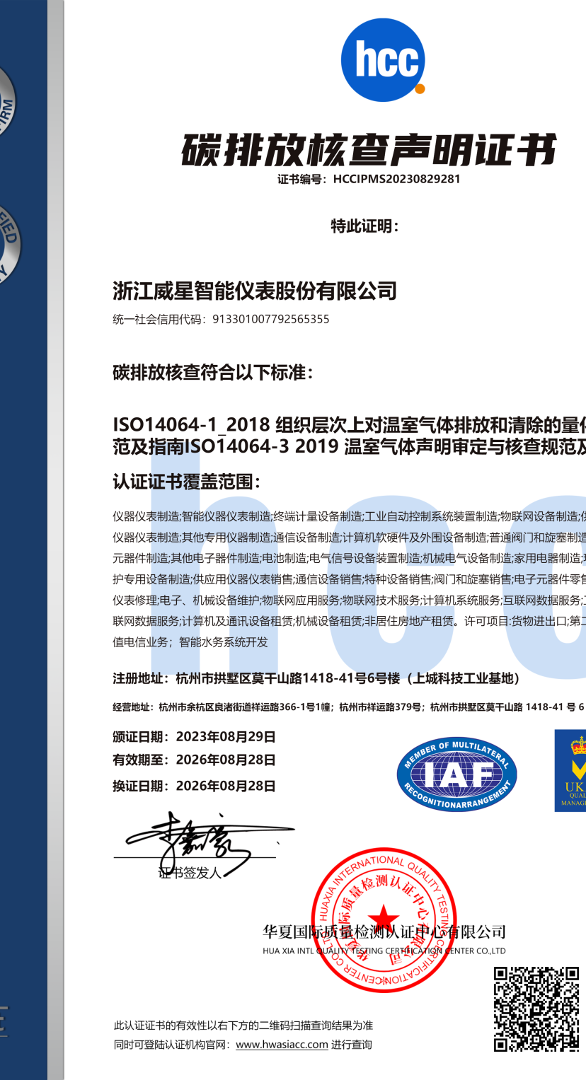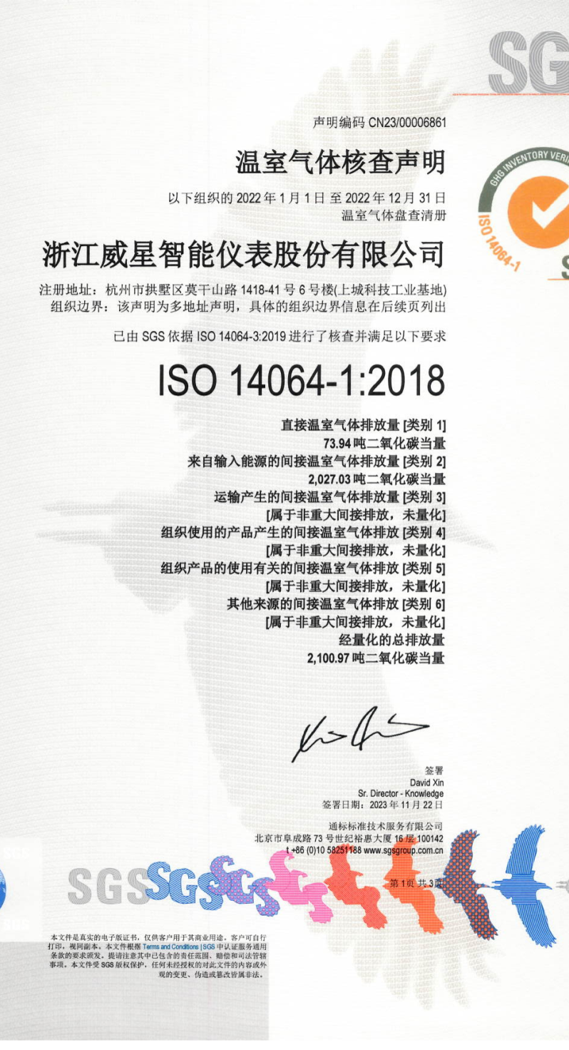 威星始終將節(jié)能減排作為企業(yè)可持續(xù)發(fā)展的關(guān)鍵,全面落實(shí)制造行業(yè)碳達(dá)峰實(shí)施方案,加大投入研發(fā)力量,不斷優(yōu)化生產(chǎn)制造工藝,致力于研發(fā)和推廣節(jié)能、環(huán)保、低碳的智能儀表產(chǎn)品,降低能源消耗和排放。同時(shí)制定了碳中和計(jì)劃,通過建立《節(jié)能降耗制度》,對(duì)資源及能源消耗加強(qiáng)管理,從而實(shí)現(xiàn)科學(xué)利用資源、降本增效的目標(biāo)。為了進(jìn)一步降低能耗,更新了變頻空壓設(shè)備,能耗降低約35%以上;此外,對(duì)計(jì)量室空調(diào)節(jié)能進(jìn)行了改善,每天減少8小時(shí)運(yùn)行時(shí)間,節(jié)省用電約20萬度,為公司實(shí)現(xiàn)了約30%的節(jié)電效果,碳排放量逐年降低,正在逐步實(shí)現(xiàn)碳中和的目標(biāo),并成功獲得“碳排放核查”、產(chǎn)品碳足跡認(rèn)證”、“ISO 14064-1 溫室氣體核查認(rèn)證”、三項(xiàng)證書。