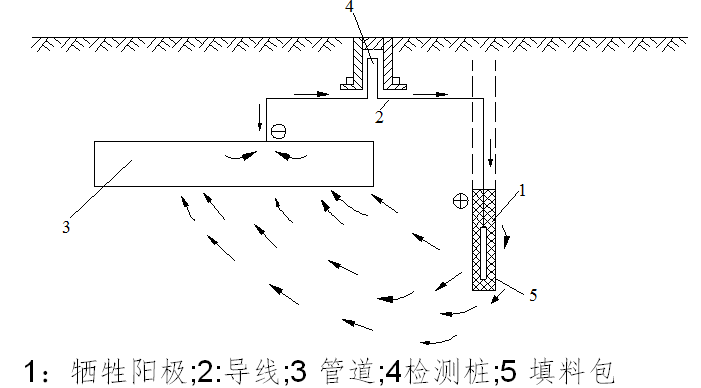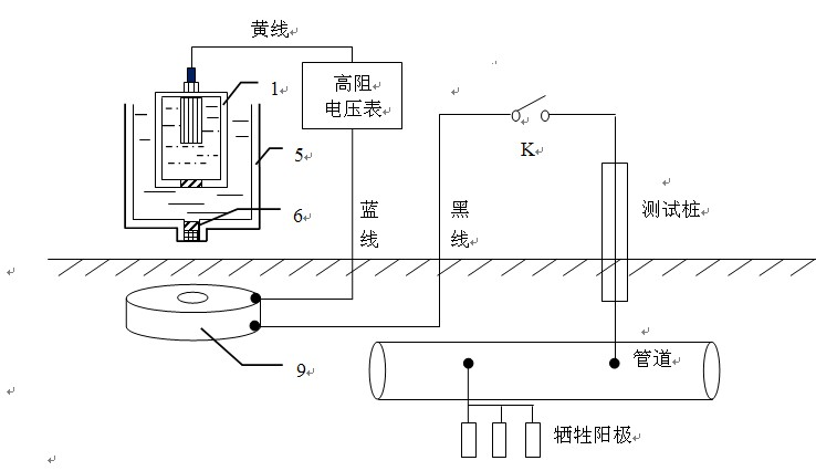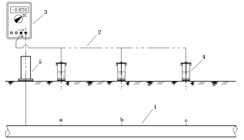 注:l-管道(被測體);2-測試導線(多股銅芯塑料軟線);3-電壓表(具有數(shù)據(jù)存儲功能,量程±5V);4-參比電極;5-測試樁