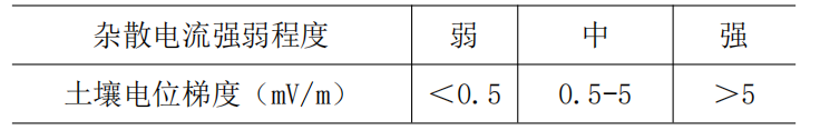 表2 雜散電流強弱程度的判斷指標(電位梯度)
