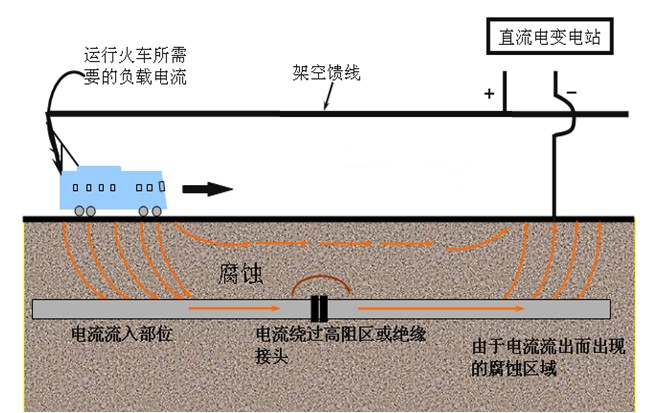 雜散電流干擾又分為直流和交流雜散電流。其中直流雜散電流對管道的腐蝕影響最大,直流雜散電流腐蝕的危害程度通常是其他形式腐蝕的100倍-1000倍。直流干擾源有直流電氣化鐵路、電車裝置、直流電網、直流電話電纜網絡、直流電解裝置、電焊機及其他構筑物陰極保護系統(tǒng)等,交流干擾源有高壓交流電力線路設施和交流電氣化鐵路設施等。