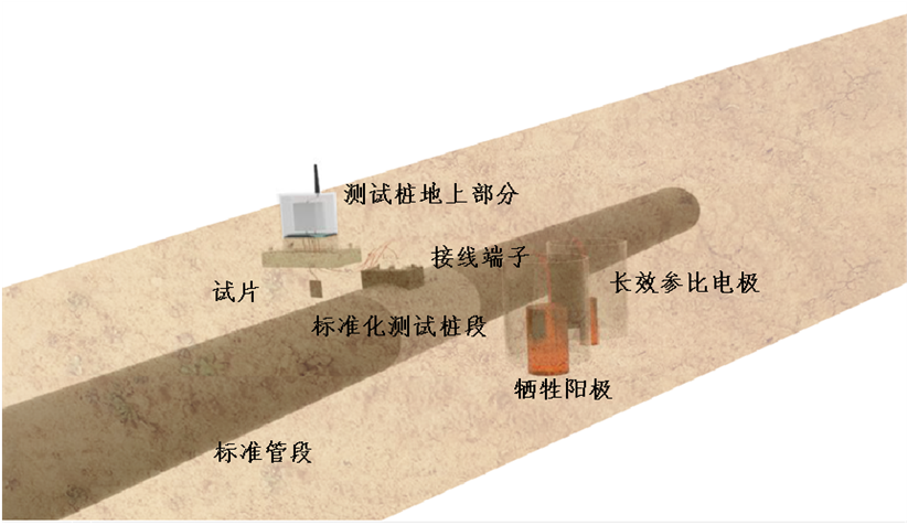 (1)長效參比電極;(2)犧牲陽極;(3)管道陰極連接;(4)試片連接;(5)通、斷電電位的測量與無線遠傳;(6)犧牲陽極外輸電流監(jiān)測。