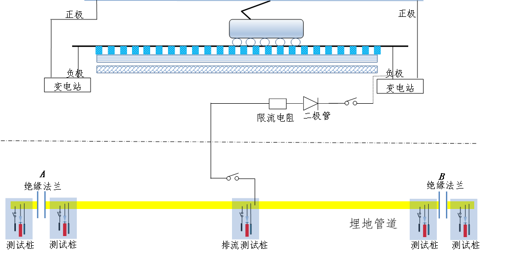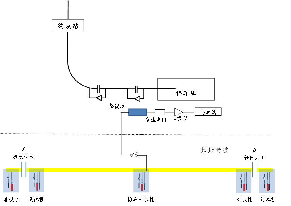 (3)將來自軌交的直流干擾歸還給軌交,對直流干擾的排除效果最好,而且在最早的國標中即提出并推薦使用,但在國內的實際應用幾乎沒有。這種排流方法需要軌交方面的接受和認可,同濟大學曾進行過3次現(xiàn)場排流實驗,使用二極管連接管道和軌交變電站的負母線,可將管地電位控制在需要的水平。