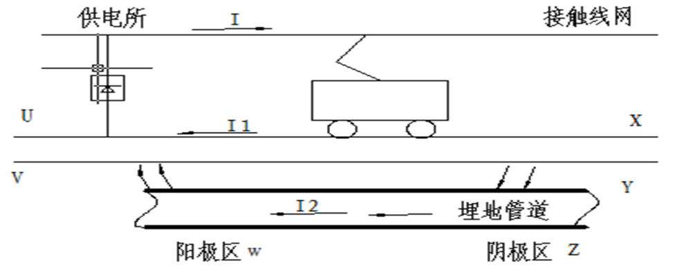 電池2:W金屬管線(陽極區(qū))→V土壤、床道→U行走軌道(陰極區(qū))。