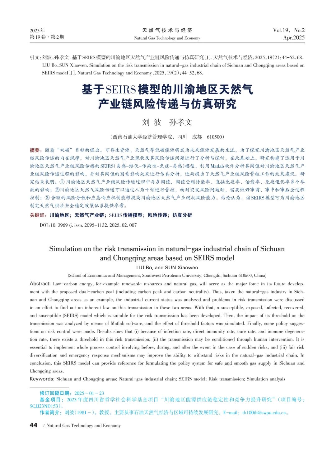 關(guān)鍵詞 川渝地區(qū);天然氣產(chǎn)業(yè)鏈;SEIRS傳播模型;風(fēng)險(xiǎn)傳遞;仿真分析