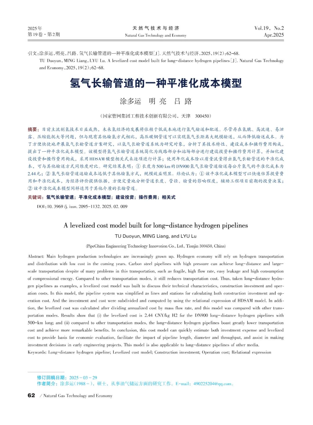 關鍵詞 氫氣長輸管道;平準化成本模型;建設投資;操作費用;相關式