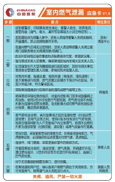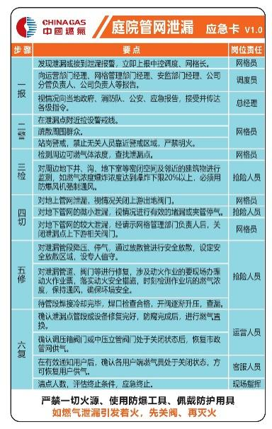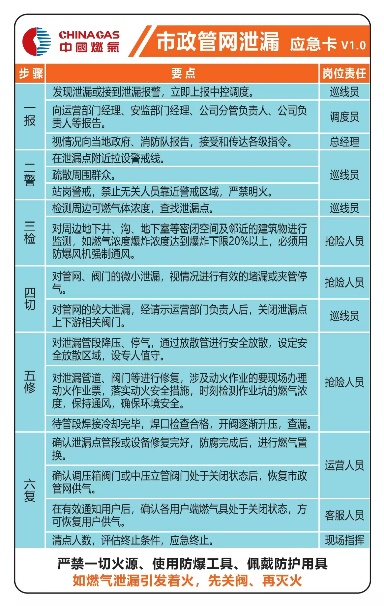 制定科學、規(guī)范、針對性和可操作性強的應急預案對于高效合理的處置燃氣管道突發(fā)事件至關重要,燃氣企業(yè)應結合燃氣管道事故的特點,制定專項應急預案,對應急機構和職責、人員、技術、設備設施、物資等方面進行詳細的安排。有針對性的制定現(xiàn)場處置方案,編制燃氣泄漏事故應急處置卡(如圖1),從而實現(xiàn)專項應急預案或應急處置方案的簡明化、卡片化。
